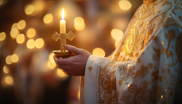 Orthodox Priest Holding Lit Candle and Golden Cross During Easter Church Service. Concept of Religious Ceremony, Christian Faith, Holy Tradition, Spiritual Worship, Easter Celebration