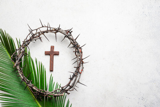 Palm Sunday. Crown of thorns, cross on palm leaf
