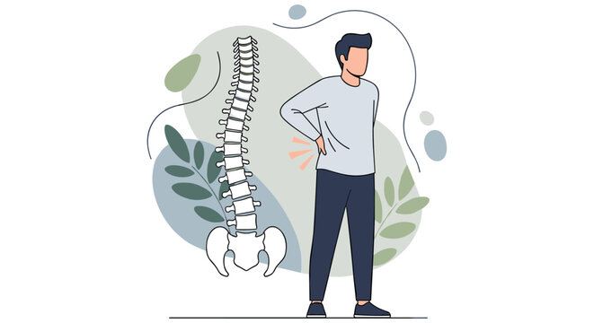 A man suffers from lower back pain, highlighting spinal discomfort with an anatomical illustration of the human vertebral column.