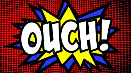 A comic strip cartoon with the word Ouch. Green and halftone background, star shape effect.