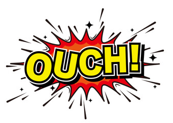 OUCH speech bubble. Ouch sound text. Doodle phrase. Hand drawn quote. Vector illustration for print on shirt, card, poster. Black, yellow and white.