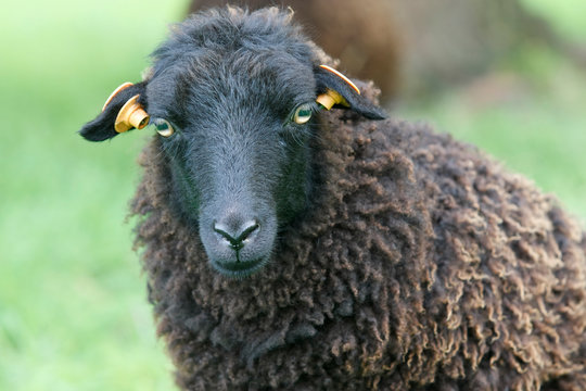 A black ouessant ewe sheep is shown up close in a grassland. Generative AI