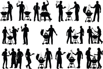 Silhouettes of people enjoying a summer barbecue with grills and food preparation in a casual outdoor setting