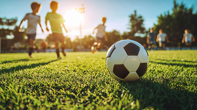 Children Playing Soccer on a Sunny Day with a Soccer Ball in Focus