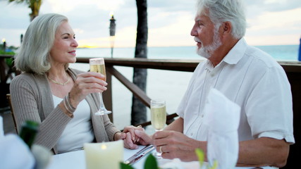 Caucasian seniors enjoying romantic dining on vacation