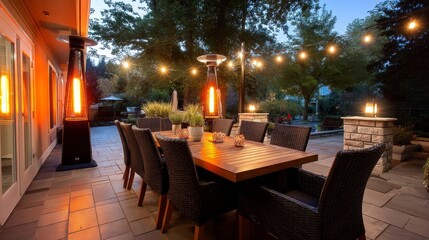 Enchanting Evening Patio with Glowing Heaters - Warmth, ambiance, relaxation, togetherness, and outdoor dining are symbolized in this inviting patio scene