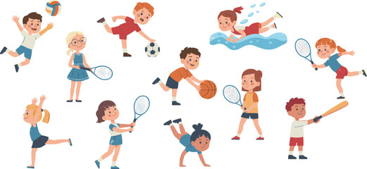 Active kids playing various sports, fun fitness activities illustration, energetic children exercising, outdoor games artwork
