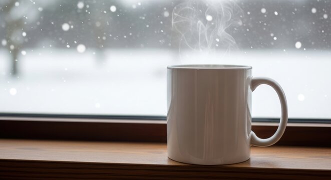 Steaming white mug on a wooden windowsill overlooking a snowy outdoor scene with falling snowflakes. Cozy winter concept for holiday and seasonal imagery.
