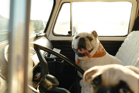Bulldog copilot ready for the road, basking in the golden sunlight.
