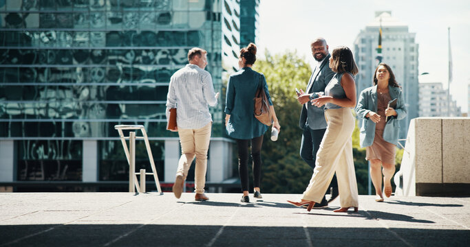 Business, people and walking in city with discussion for campaign ideas, project planning and morning commute. Businessman, woman and employee journey to appointment, meeting and outdoor networking
