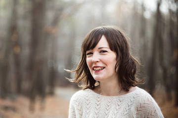 Portrait of young smiling woman face partially covered with flying hair in windy day standing at mountain - carefree woman
