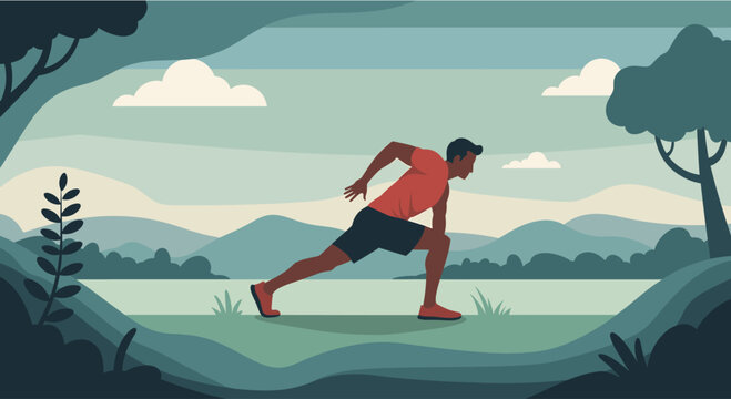A man stretches his leg in a vibrant outdoor park setting, perfect for a health and wellness banner or landing page, showcasing a healthy lifestyle with flat design.