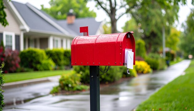 Red mailbox with raised flag on a rainy suburban street, outgoing mail visible