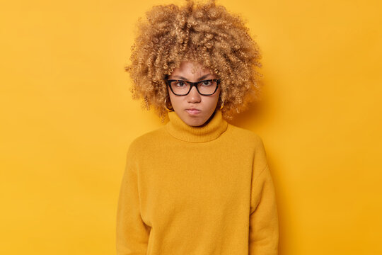 Horizontal shot of outraged curly haired woman frowns face looks angrily being irritated with someone wears transparent glasses and casual sweater isolated over yellow background. Negative emotions