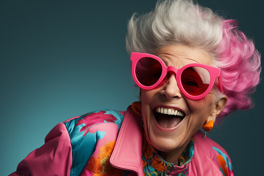Happy, cool, fashionable old lady in outrageous pink clothes and sunglasses.
