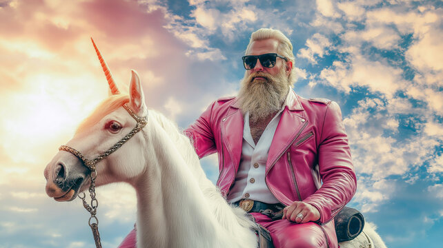 A man riding a white unicorn in a pink suit under a bright cloudy sky, creating a whimsical and magical atmosphere