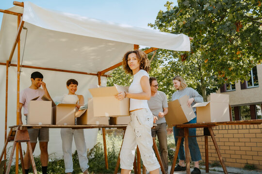 Smiling woman holding donations box for community service