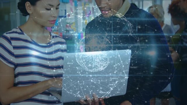 Animation of connections and globe over diverse woman and man working on laptop in office