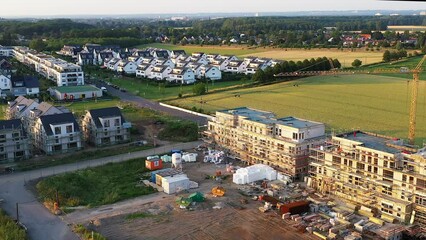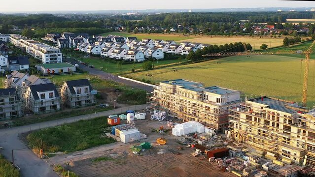 A construction site of an apartment building on the edge of a housing estate on the outskirts of a large city in Germany.