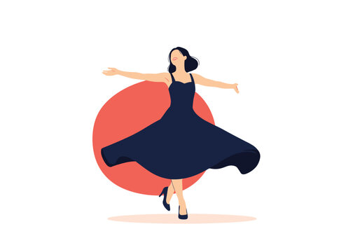 Elegant woman dancing joyfully in a flowing dark blue dress with arms outspread