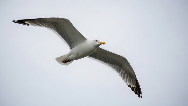 Large coastal seagull flying with outspread wings against a minimal light grey background showcasing elegant avian flight patterns.