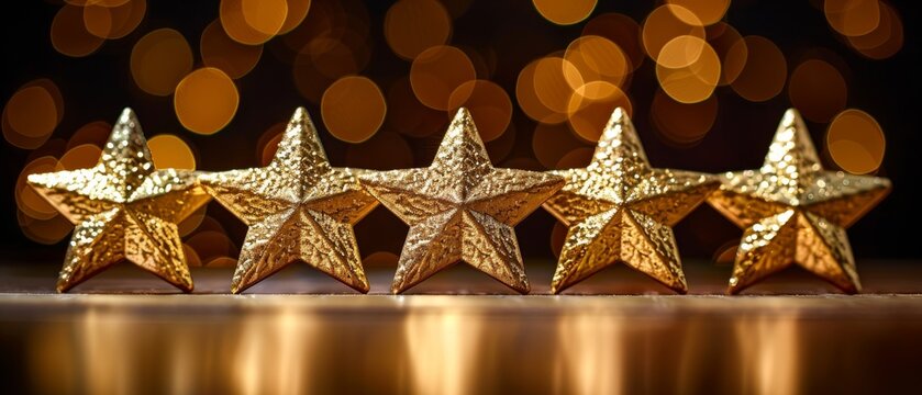 Golden five-star rating, symbolizing excellence and quality, with bokeh background. Ideal for reviews and feedback themes.