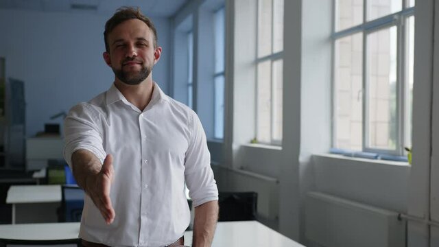 Strong African American 30s man businessman office agent male guy stand indoors outstretch palm stop hold hand in front protect no defense rejection keep distance protest against ethnic discrimination