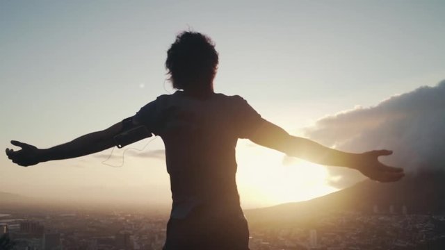Inspirational hiker celebrating nature on mountain peak, national public lands day
