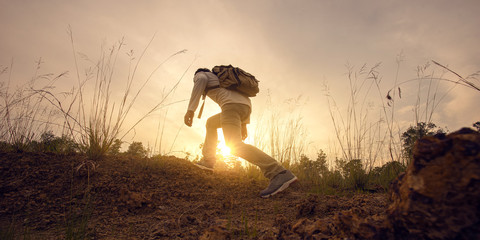 Man hiker adventure to overcome limit of life on the trail at sunset mountains with  backpack.