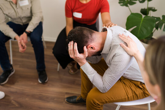 Group therapy session, empathy concept, psychological support, diverse friends overcome problem together, addiction treatment or team building close up.