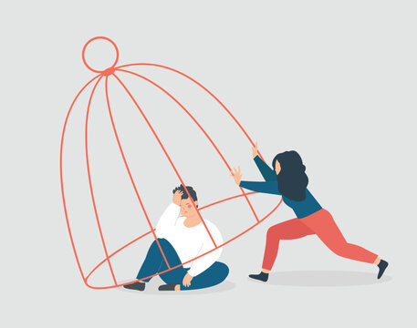 Psychologist helps a man inside a cage to be free. Rehabilitation from depression, addiction and PSDD therapy. Concept of psychiatric support, recovery, and self awareness. Vector illustration