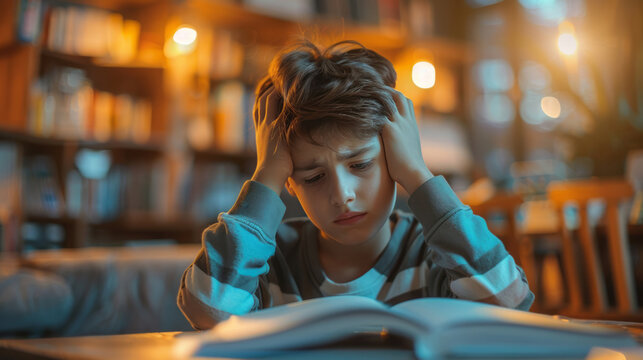 A boy sits at his desk, looking stressed as he reviews an English textbook.