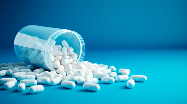 Prescription medicine, opioids. Bottle of many pills on blue background. Concepts of addiction, opioid crisis, overdose with copy space