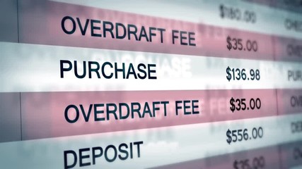 A close-up of a hand stamping "Overdrawn" on a financial document, symbolizing insufficient funds or banking overdraft issues.