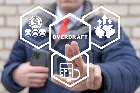 Overdraft Bookkeeping Finance Business Concept. Businessman using virtual touchscreen presses overdraft inscription.
