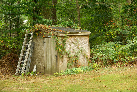 Red brick house abandoned during construction with broken window and destroyed front wooden doors covered with green crawler plant overgrowth on warm summer day