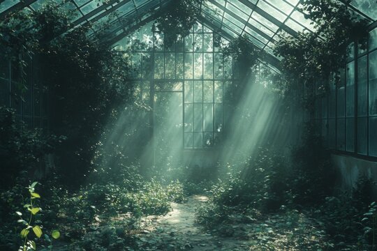 Sunlight filters through broken glass panels of an abandoned greenhouse, illuminating dense vines and lush overgrowth that dominate the space Generative AI