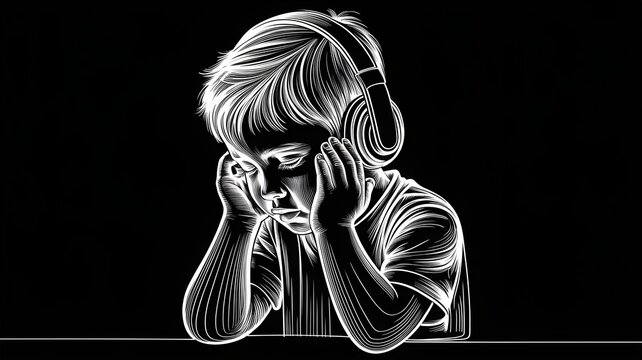 Autistic child boy wearing headphones in white line art style with expressive lighting on black background representing sensory processing and sound hypersensitivity