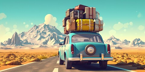Trip to travel by car in a beautiful landscape with transport overloaded with suitcases, concept of Excessive burden, created with Generative AI technology