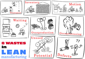 8 Wastes of Lean icon set. Containing non-utilize talent, waiting, transportation, inventory, motion, overproduction, defects and extra processing symbol. Solid icon collection.