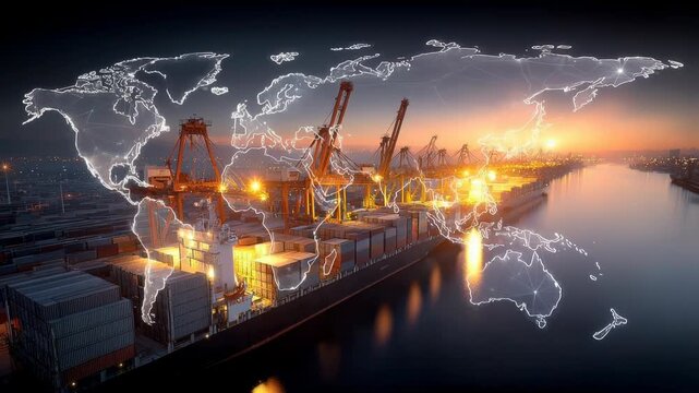 Global Trade Route - A dynamic depiction of international commerce, with a cargo ship navigating the harbor. Illuminated by the sunset, it symbolizes global connections.