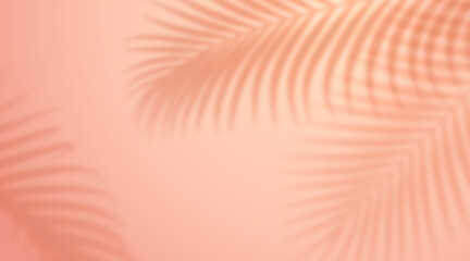 Realistic shadow from leaf of palm tree on orange background. Tropical leaves shadow. Mockup with palm leaves silhouette. Vector illustration backdrop with exotic leafage of fern plant, overshadow
