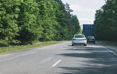 Semi truck with van trailer overtake flatbed dump truck on autumn country highway road, rear view