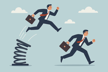 Competitive advantage or innovation to outsmart and overtake business winning, strategy or smart way to win business or career growth concept, businessman jumping springboard to outsmart competitor.