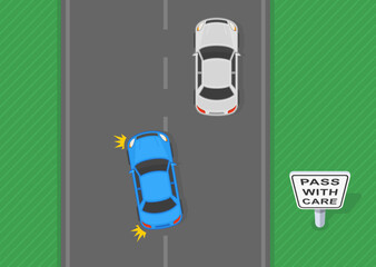 Traffic regulation rules and tips. "Pass with care" sign area. Passing is allowed. Top view of a sedan car trying to overtake another vehicle. Flat vector illustration template.