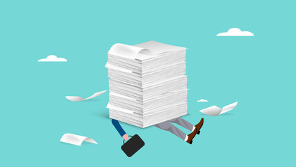 heavy workload with fatigue businessman buried under pile of paper or unfinished work near deadline, overwork make employee exhausted and stressed leads to depression, burnout and low efficiency