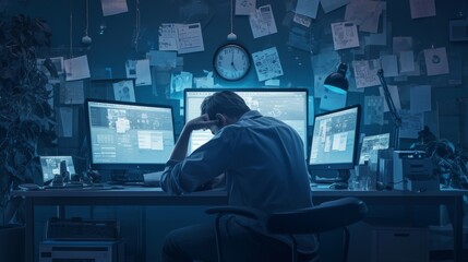 Businessman overwhelmed with paperwork in office depicting stress and overwork concepts. Concept Work Stress, Overwhelmed Employee, Office Chaos, paperwork troubles, Busy businessman