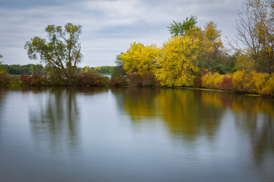 Gorgeous lake view with autumn golden color vineyard, at the western shore of Cayuga Lake in Finger Lakes region of Ovid, New York. Winery house on the lakeshore