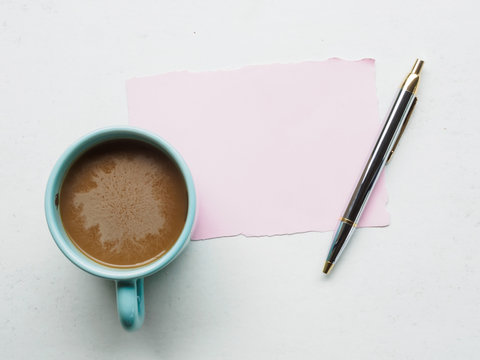 Top view coffee cup , pen and note blank page on desk work place