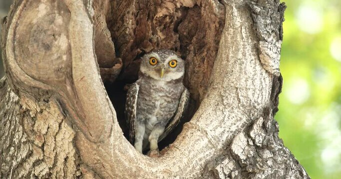Spotted owlet (Athene brama) in a hole of tree, Thailand. High definition shot at 4K video footage.